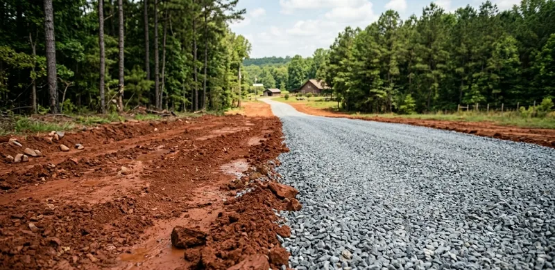 In Wayne County, Georgia, a gravel driveway is significantly less expensive than concrete both to install and to restore. A full concrete driveway installation runs $8–$15 per square foot, while a gravel driveway installation typically runs $8–$18 per linear foot for a 12-foot-wide surface — a fraction of the concrete cost for the same length. Concrete also requires full removal and replacement when damaged, while a gravel driveway can be rebuilt, regraded, and resurfaced for a fraction of the original cost. For rural Wayne County properties with long access driveways, gravel is almost always the practical choice.