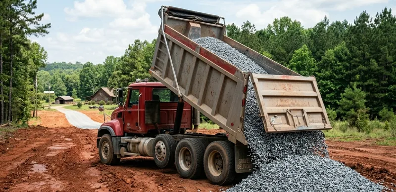 Rural driveways in Wayne County present logistics that suburban gravel delivery services don't plan for — long hauls from the road to the structure, limited turning radius for loaded trucks, soft approaches in wet conditions, and properties where multiple dump truck loads need to be coordinated. We assess access conditions before scheduling Jesup gravel delivery so there are no surprises on delivery day. If access is tight, we adjust the truck configuration or staging approach. Material is spread as it is delivered — not stockpiled for separate equipment to handle later.